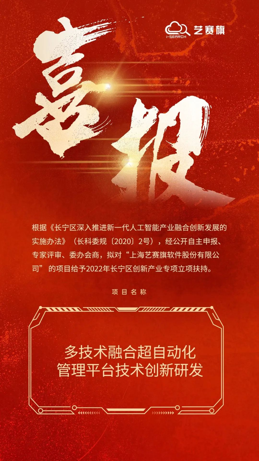 長(chang)(chang)寧(ning)區(qu)創(chuang)(chuang)新(xin)(xin)產(chan)(chan)(chan)業(ye)專項項目(mu),是長(chang)(chang)寧(ning)區(qu)為鼓勵企業(ye)技(ji)術創(chuang)(chuang)新(xin)(xin),推進(jin)落實數字(zi)化(hua)轉型(xing)工(gong)作部署,促進(jin)科技(ji)經濟融合,充分發揮科技(ji)專項資(zi)金對創(chuang)(chuang)新(xin)(xin)產(chan)(chan)(chan)業(ye)發展的(de)引導和推進(jin)作用(yong),而(er)圍(wei)繞區(qu)域創(chuang)(chuang)新(xin)(xin)發展體系(xi)及產(chan)(chan)(chan)業(ye)創(chuang)(chuang)新(xin)(xin)能(neng)力(li)建設開展的(de)競爭性分配(pei)項目(mu)(經評審后(hou)擇優扶(fu)持)。藝賽旗憑(ping)借在超自動化(hua)領域前瞻性的(de)技(ji)術創(chuang)(chuang)新(xin)(xin)研發優勢脫穎而(er)出。