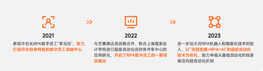 2023年,進一步加大對 RPA 機器人和智能化技術的投入,以(yi)“流程挖掘+RPA+AI”的超級自動化(hua)技術(shu)為依托,助力申能從基礎自動化階段逐漸邁向超自動化階段。