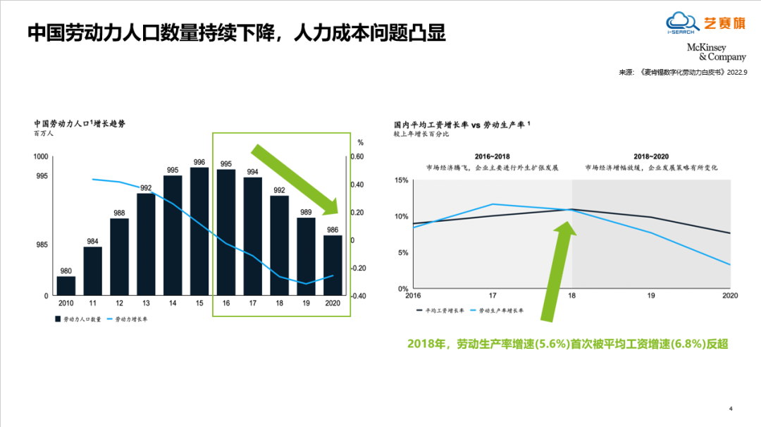李(li)博首先為我們介紹了數(shu)字員工的(de)概念及(ji)應(ying)用趨勢(shi)(shi):根據(ju)《麥肯錫(xi)數(shu)字化勞動力(li)白皮(pi)書》的(de)報告,自(zi)2016年(nian)起,中國人口增(zeng)(zeng)長趨勢(shi)(shi)已連續五年(nian)呈現嚴峻的(de)下降態(tai)勢(shi)(shi),同時,自(zi)2018年(nian)起,中國勞動生產力(li)的(de)增(zeng)(zeng)速首次(ci)被(bei)平均工資的(de)增(zeng)(zeng)速超(chao)過,這意(yi)味(wei)著(zhu)人力(li)成本(ben)問題愈(yu)發突出(chu)。在這一(yi)背景下企業將(jiang)需(xu)要采取(qu)創新的(de)方式來應(ying)對(dui)這些挑戰(zhan),自(zi)動化技術(shu)被(bei)視為有效的(de)解決方案之一(yi)。