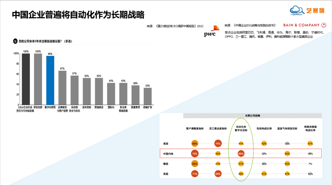 從過去三年的疫情影響來看,實際上并沒有對企業堅持數字化轉型戰略產生太大的影響。企業仍然認為數字化轉型非常重要,并將其視為長期的戰略任務。根據《中國企業ESG戰略與實踐白皮書》顯示,在中國內地,大約66%的企業認為自動化是數字化轉型的一個優勢切入點。