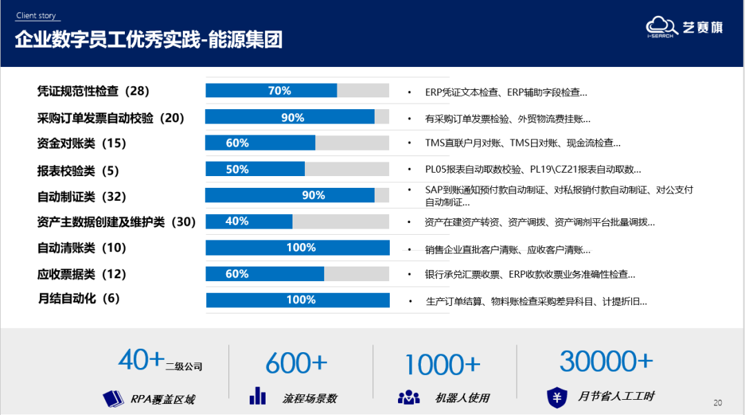 接下來李博為我們介紹了藝賽旗數字員工在某能源企業的優秀案例,目前藝賽旗超自動化產品已覆蓋了該企業財務部門諸多關鍵業務流程,通過RPA機器人實現了高效的數據處理和財務管理。