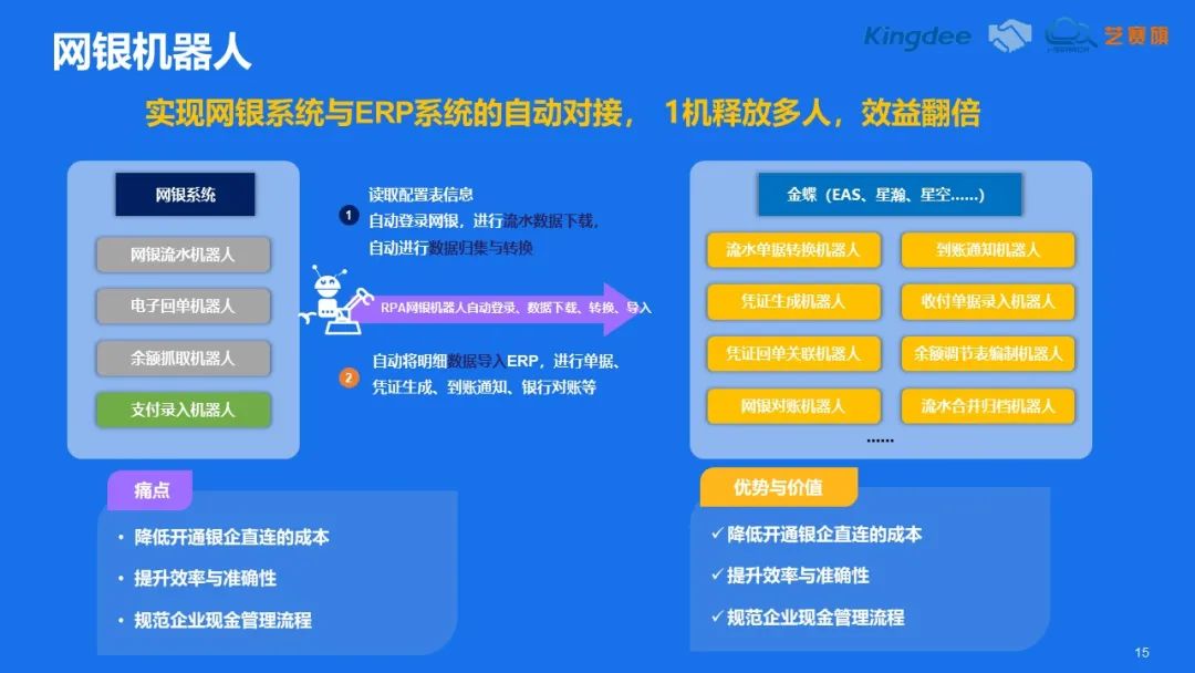 這里我們可以采取一種全新的思路,即利用RPA技術來實現企業內部系統與網銀數據的智能對接,藝賽旗網銀機器人可以模(mo)擬人工用戶的(de)操作(zuo),自動登錄網銀平(ping)臺,獲(huo)取數據(ju),然后(hou)將其傳輸到(dao)企(qi)(qi)業內部的(de)ERP系統(tong)中,實現非銀企(qi)(qi)直連(lian)賬戶與財務系統(tong)的(de)智能(neng)連(lian)接,包括自動獲(huo)取網銀的(de)交易(yi)流水、余額(e)、電子回單(dan)等任務,解決手動查詢(xun)錄入繁瑣的(de)問題。網銀機器人不僅降低了企業開通銀企直聯的成本,還提高了操作的效率和準確性。