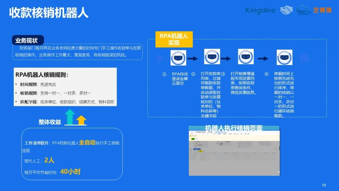 最后(hou)一(yi)個案例涉及財務核銷。這是(shi)一(yi)個廣泛應用于不(bu)(bu)同企(qi)業(ye)(ye)的自動(dong)化需求,不(bu)(bu)同企(qi)業(ye)(ye)可能有不(bu)(bu)同的核銷需求,但核心目(mu)標都是(shi)根(gen)據自身的業(ye)(ye)務(wu)規則進行收(shou)款數據的核銷。