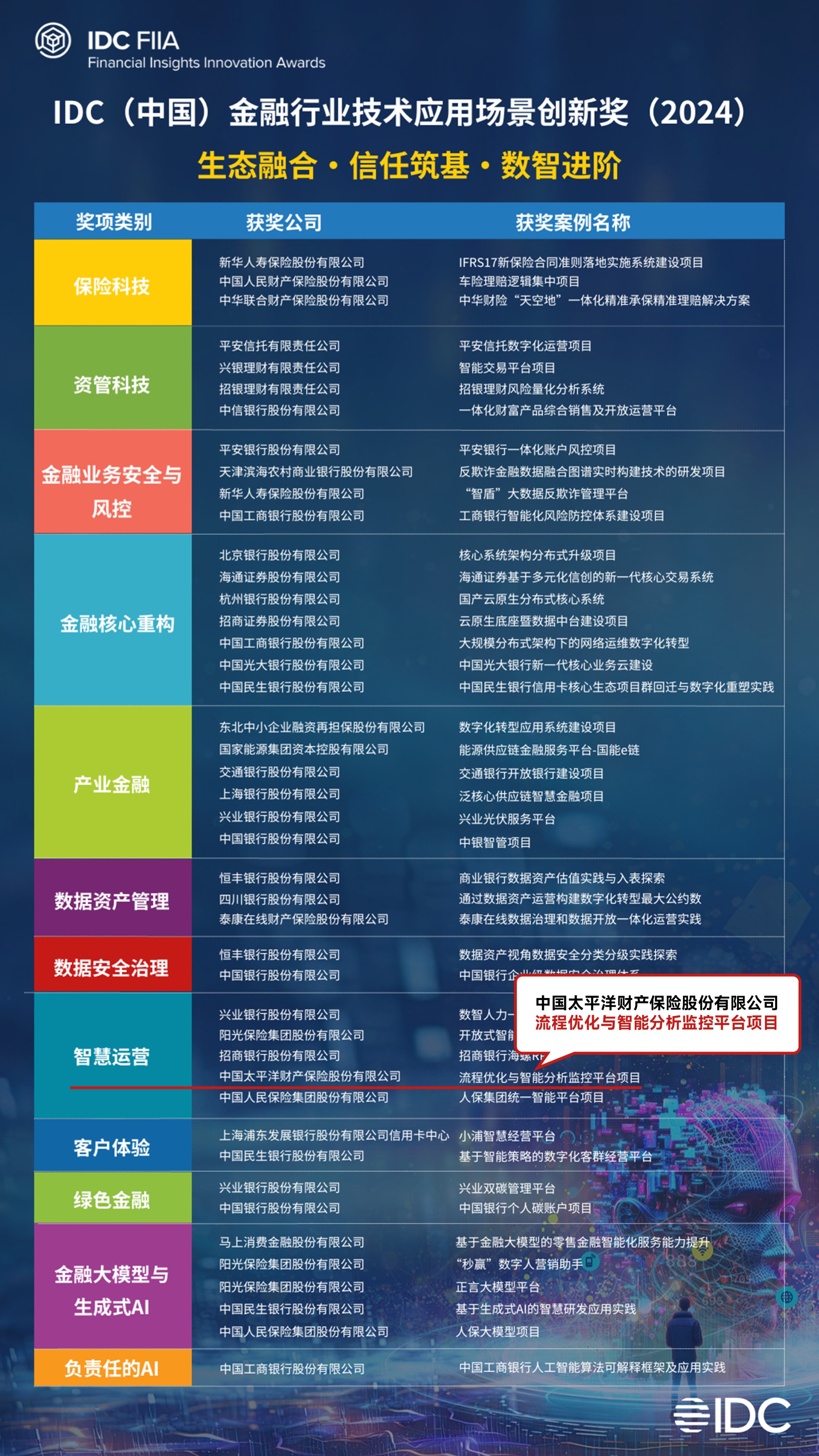 值得一提的是智慧運營獎是IDC為對于原本不在本次預設的十個獎項范圍之內,卻具有行業共性的案例新增的獎項,充分體現了金融機構在業務承壓大環境下利用科技手段降本提效的行動力。隨著科技的迅猛發展,智慧金融正在重塑傳統金融服務的模式,為用戶帶來更加個性化、便捷化、智能化的金融體驗。